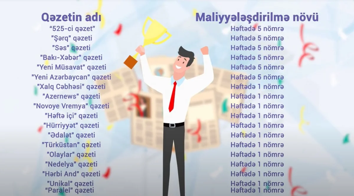 Qeyd edək ki, həftədə bir nömrəsi maliyyələşdirilən qəzetlərin hər birinə aylıq 5 000 manat, həftədə beş nömrəsi maliyyələşdirilən qəzetlərin hər birinə isə aylıq 15 000 manat məbləğində maliyyə yardımı göstəriləcək. Müsabiqədə qalib elan olunan hər bir qəzet redaksiyasının eyniadlı veb-saytına 3 000 manat məbləğində maliyyə yardımı göstəriləcək. Qalib elan olunan qəzetin baş redaktoru müsabiqəyə müraciət ərizəsində qəzetinin eyniadlı veb-saytını əsaslı yeniləmək niyyətini ifadə etmişdirsə, maliyyə yardımı göstərilən 6 aylıq dövrün birinci ayında ona həmin veb-saytın əsaslı yenilənməsi məqsədilə 5 000 manat məbləğində vəsait ayrılır.