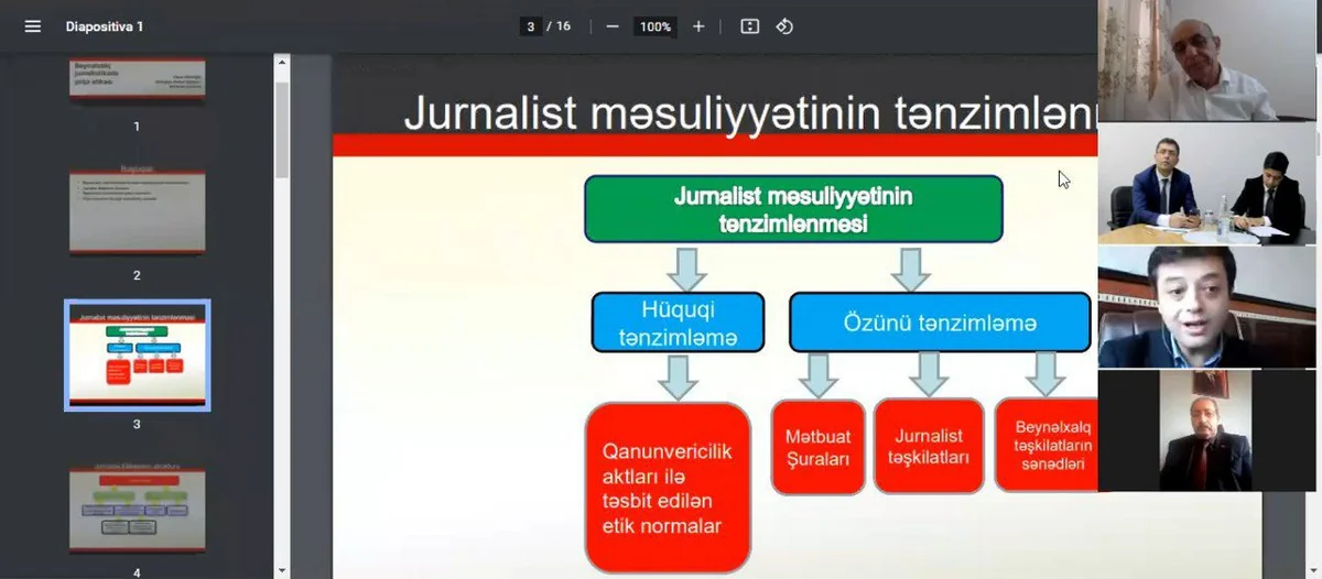 Sonra Bakı Dövlət Universitetinin Jurnalistika fakültəsinin dekanı Vüqar Zifəroğlu “Beynəlxalq jurnalistikada peşə etikası” mövzusunda təqdimatla çıxış edib.