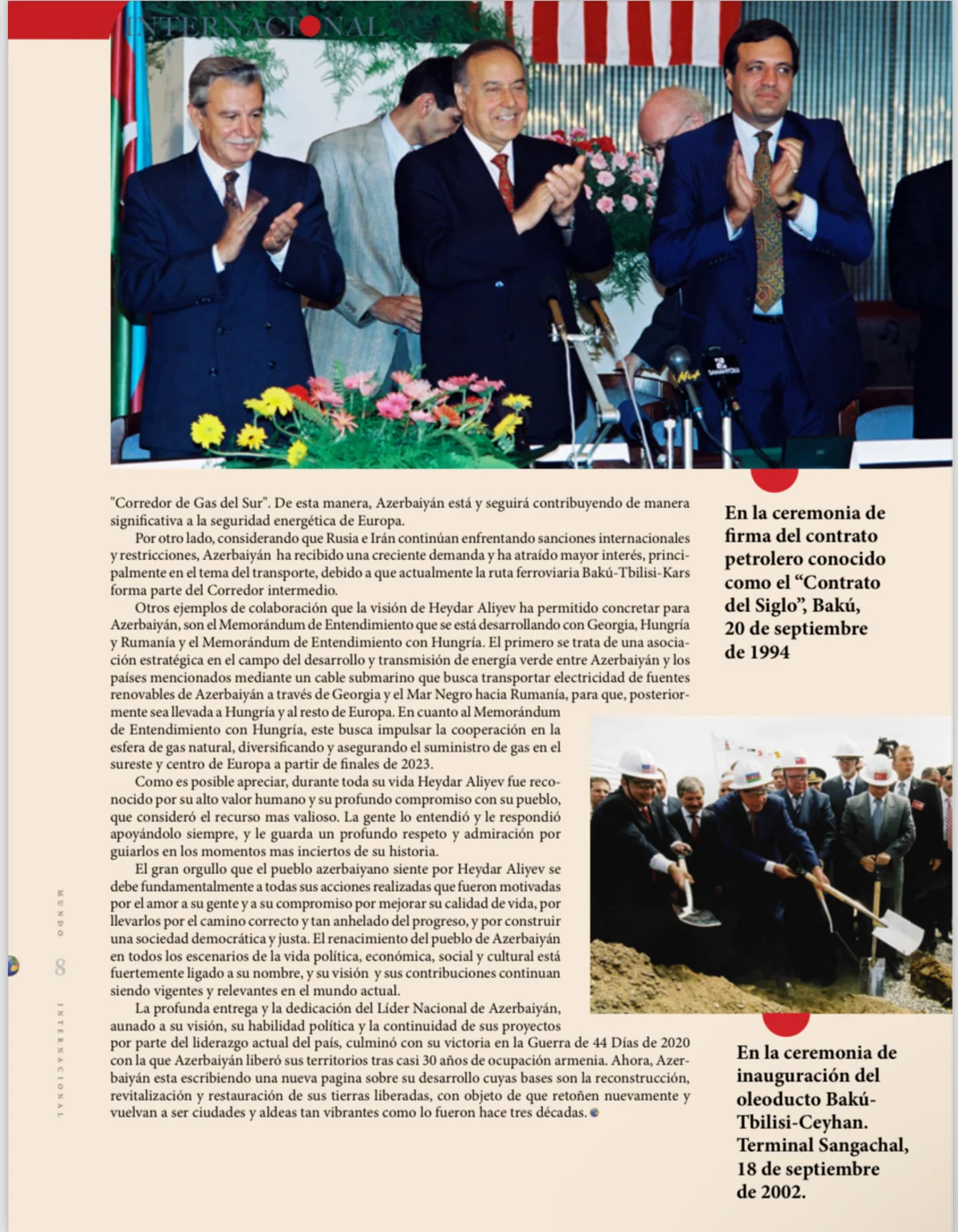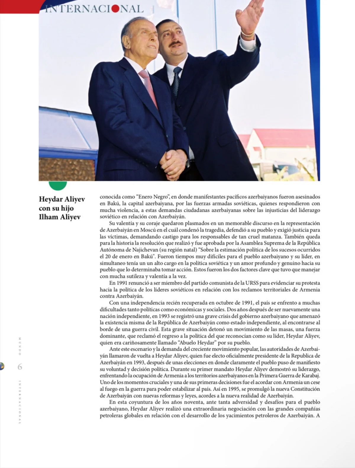 Meksikanın dövlət və hökumət qurumları, parlament, akademik dairələri və ölkədə akkreditə olunmuş diplomatik korpus üzvləri arasında geniş yayılan “Mundo Internacional” jurnalında Azərbaycanın Ümummilli Lideri Heydər Əliyevə həsr edilən “Hər bir xalqın lideri ona layiq olur” başlıqlı iri həcmli məqalə dərc olunub.
