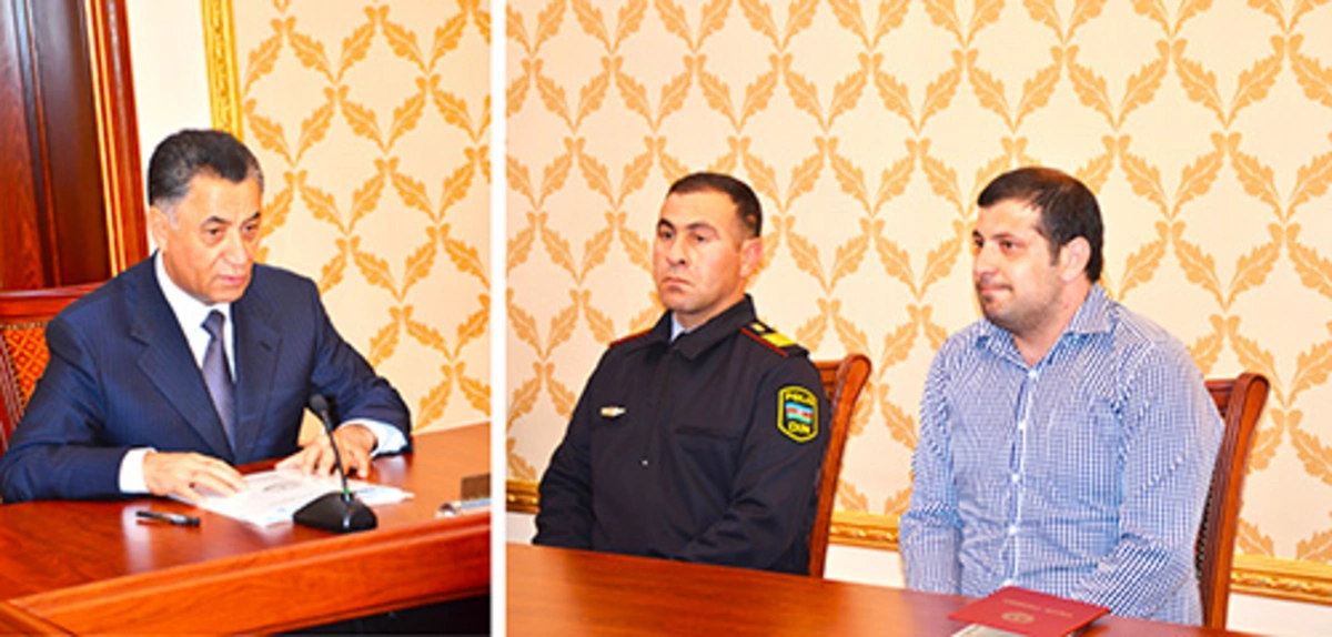 Bakı. 22 may. REPORT.AZ/ Daxili işlər naziri, general-polkovnik Ramil Usubov paytaxtın Binəqədi rayonu ərazisində yerləşən çoxmərtəbəli yaşayış binasında baş vermiş yanğın zamanı cəsarət və fədakarlıq göstərərək tüstüdən boğulan körpəni alovların içindən sağ-salamat çıxardığına görə dünyanın nüfuzlu media orqanları tərəfindən "qəhrəman polis" adlandırılan polis əməkdaşı Elvin Abışovu və ekstremal şəraitdə peşə borcunu ləyaqətlə yerinə yetirərək əsl vətəndaşlıq mövqeyi nümayiş etdirən "Report.az" İnformasiya Agentliyinin fotomüxbiri Orxan Əzimovu qəbul edib.