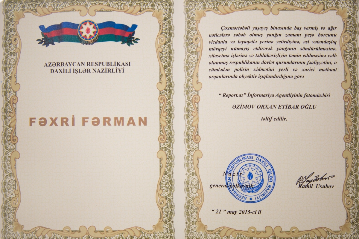 Daxili işlər naziri yanğınsöndürmə və xilasetmə işlərinə cəlb olunmuş dövlət qurumlarının, o cümlədən polisin fədakar xidmətini yerli və xarici KİV-lərdə obyektiv şəkildə işıqlandırdığına görə Orxan Əzimova Daxili İşlər Nazirliyinin "Fəxri fərmanı"nı da təqdim edib.