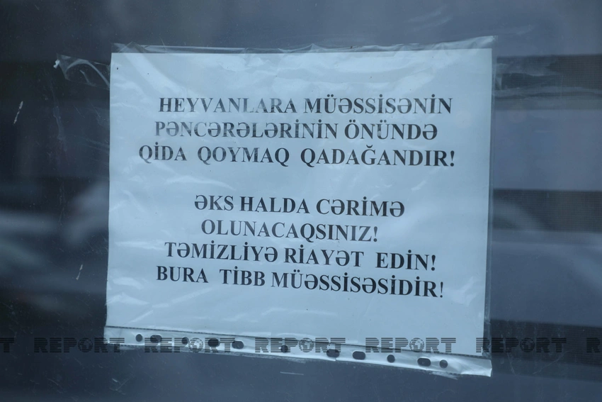 “Heyvanlara müəssisənin pəncərələrinin önündə qida qoymaq qadağandır! Əks halda cərimə olunacaqsınız! Təmizliyə riayət edin! Bura tibb müəssisəsidir!”.