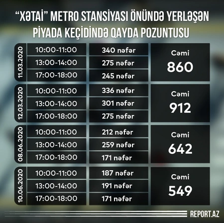 Monitorinqin ilk 2 günü sosial izolyasiya tədbirlərindən öncə martın 11-i və 12-nə, 2 günü isə iyunun 8-i və 10-na təsadüf edib. Monitorinq qrupu piyadaların qırmızı işıqda yolu keçməsi, qaydanı bilərəkdən pozması hallarını hesablayıb.