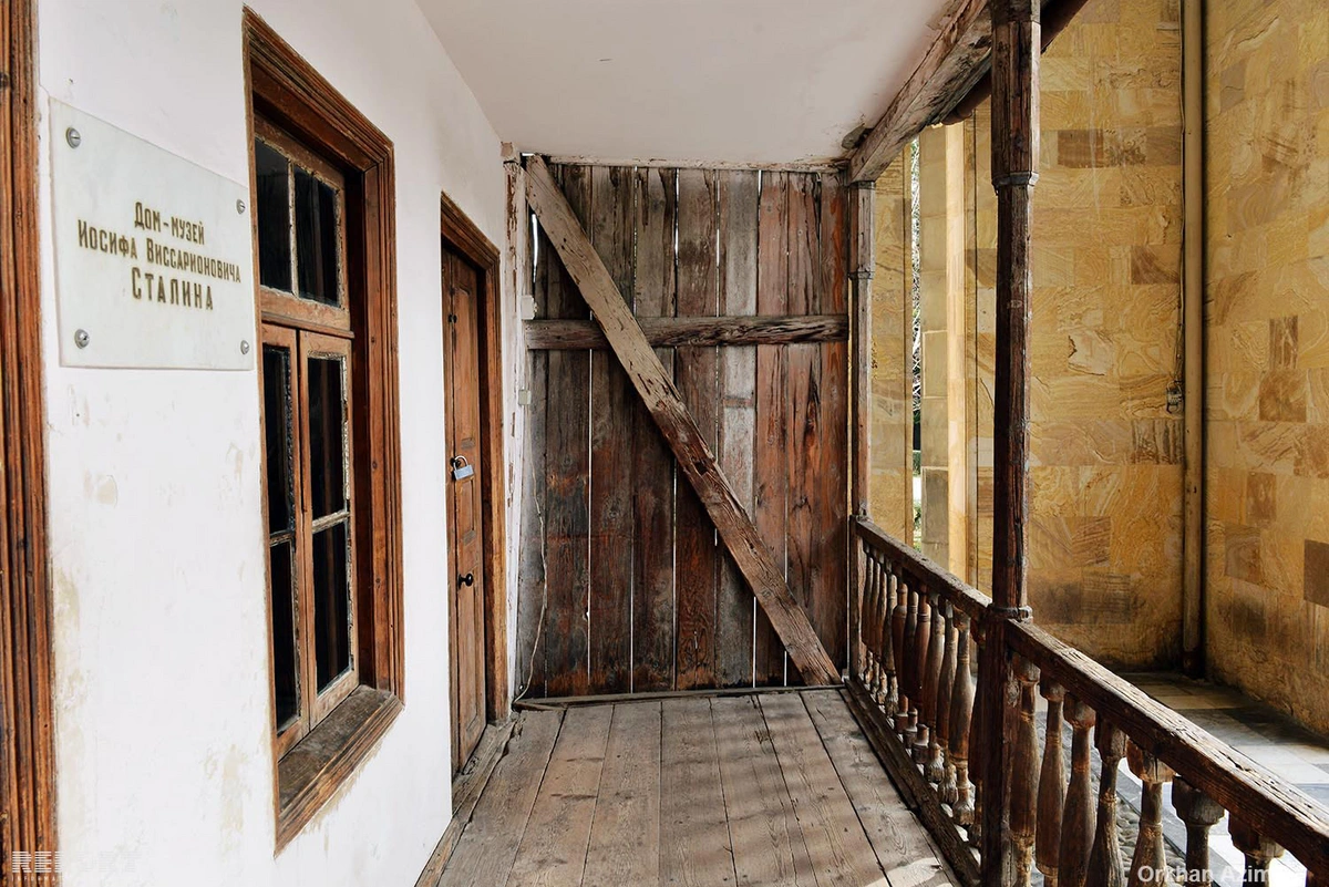 Eni bir metrdən çox olmayan, qaralmış köhnə döşəməli, alcaq sütunu artırmada iki ayrı-ayrı otağa açılan qapı var. Stalinin doğulduğu otaqda köhnə örtüklü taxta yataq, balaca masa, güzgü, saxsı qablar, neft lampası, qədimi samovar bu gün də qorunub saxlanılır.