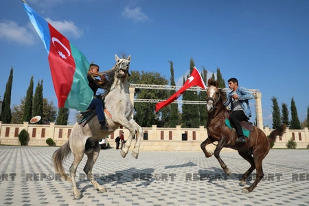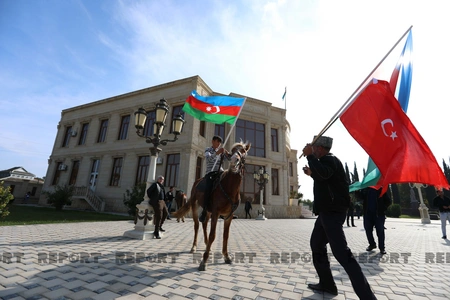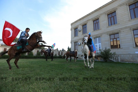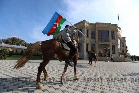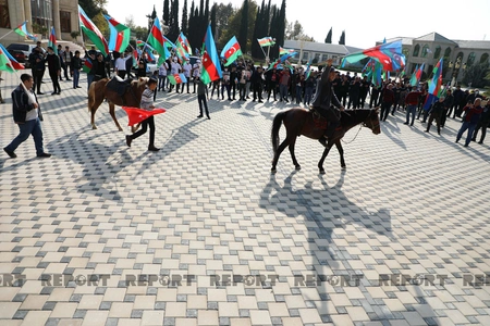 Küçələrə çıxan yürüş iştirakçıları Qarabağla, qələbə ilə bağlı şüarlar səsləndirirlər. Onlar avtomobillər və atlarla yürüş keçirirlər.