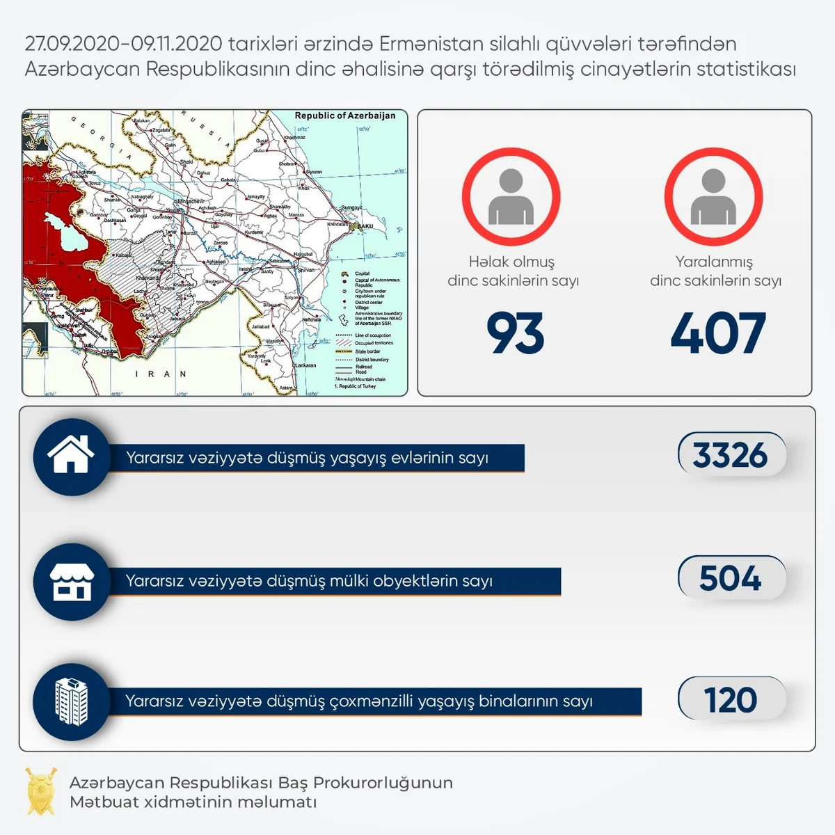 Qurumun Mətbuat xidmətindən "Report"a verilən məlumata görə, Ermənistan silahlı qüvvələrinin hücumları nəticəsində sentyabrın 27-dən indiyədək 93 mülki şəxs qətlə yetirilib, 407 nəfər isə yaralanıb.