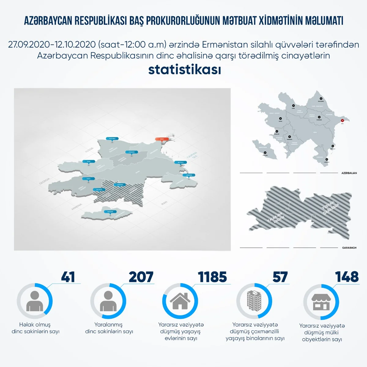 Baş Prokurorluq 27 sentyabr 2020-ci il tarixindən 12 oktyabr 2020-ci il tarixinədək Ermənistanın Azərbaycanın mülki əhalisinə qarşı hücumları ilə bağlı yeni məlumat yayıb.