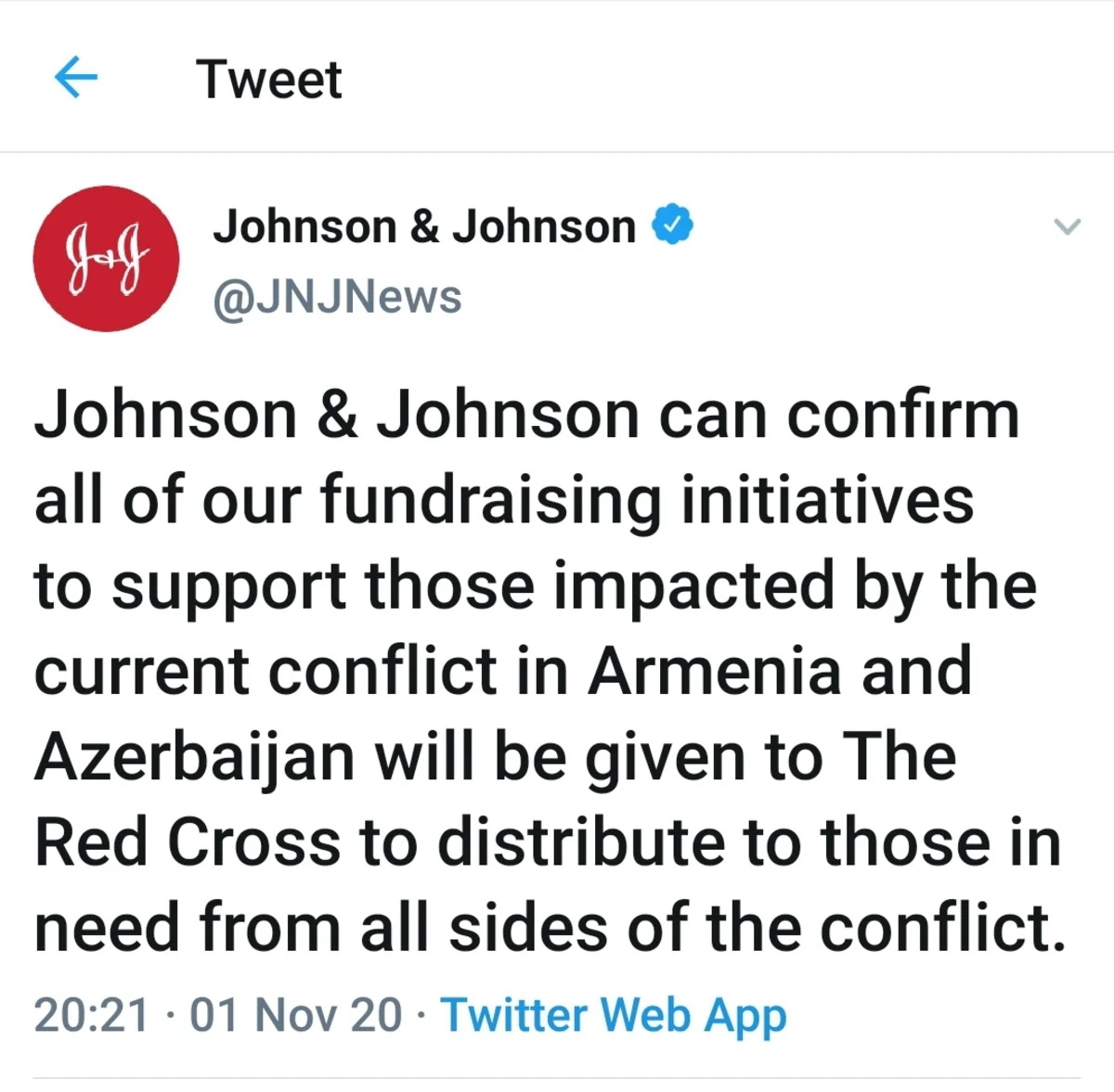 ABŞ-ın “Johnson&Johnson” şirkəti səhvini düzəldərək rəsmi tvitter səhifəsində separatçıları dəstəkləyən statusunu silib. "Report" xəbər verir ki, şirkət tərəfindən müharibə nəticəsində Azərbaycan və Ermənistanda zərər görmüş şəxslərə yardım ediləcəyi ilə başlı yeni məlumat paylaşılıb.