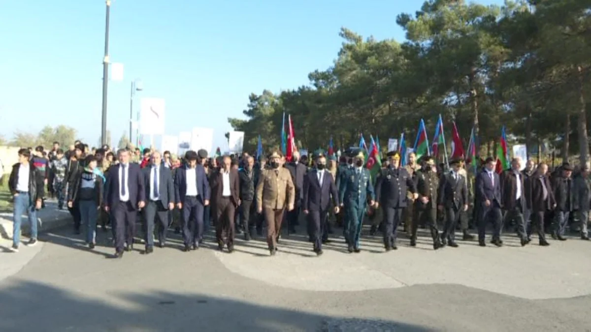 Sonra minlərlə neftçalalının qatıldığı yürüş Heydər Əliyev prospektindən start götürüb. Yürüş iştirakçıları əllərində üçrəngli bayraqla irəliləyərək bir kilometrə yaxın məsafəni qət edib. Qarabağ savaşlarında torpaqlarımız uğurunda canlarından keçmiş şəhidlərin xatirəsinə ucaldılmış abidə kompleksini ziyarət ediblər. 213 şəhidin barelyefi vurulan abidənin önünə əklil və gül dəstələri qoyulub, ruhlarına dualar oxunub. Sonra mədəniyyət evinin qarşısında zəfər bayramı təşkil olunub.