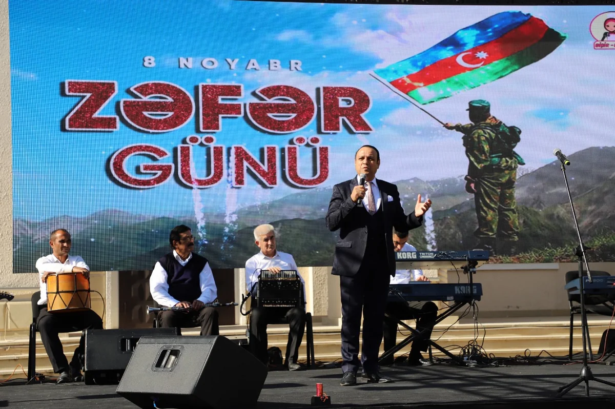 Dövlət himni səsləndirilib və şəhidlərin əziz xatirəsi bir dəqiqəlik sükutla yad edilib. Zəfər yürüşü incəsənət ustalarının rəngarəng konsert proqramı ilə davam edib.