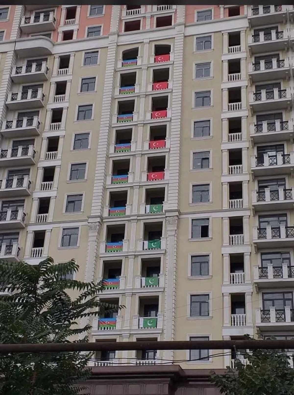 Paylaşımda Azərbaycan, Türkiyə və Pakistan bayraqlarına bürünmüş bina şəkli öz əksini tapıb.