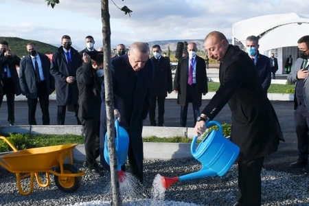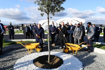"Report" xəbər verir ki, dövlət başçıları əvvəlcə aqroparkın ərazisində çinar ağacı əkiblər.
