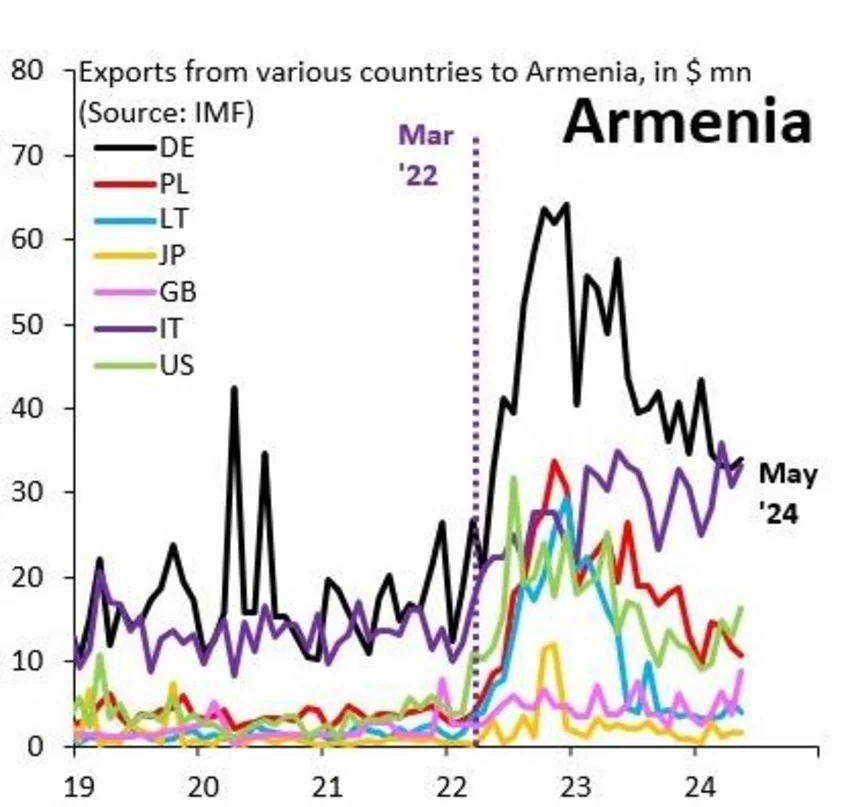 Avropa İttifaqının 2022-ci ildə Rusiyaya qarşı sanksiyalara başlamasından sonra Ermənistanın Rusiyaya olan ticarət dövriyyəsində əhəmiyyətli dərəcədə artım müşahidə olunur. Belə ki, Ermənistanın bu artımın kökündə Avropa İttifaqından aldığı məhsulları Rusiyaya satması dayanır.