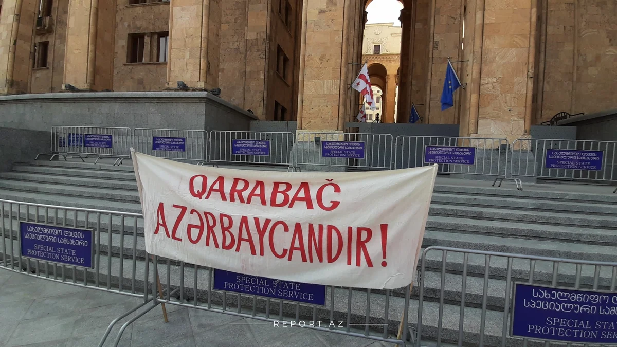 Tbilisidə Gürcüstan parlamentinin binası qarşısında azərbaycanlı icmasının üzvləri "Erməni terroruna son!" şüarlı aksiya keçirirlər.