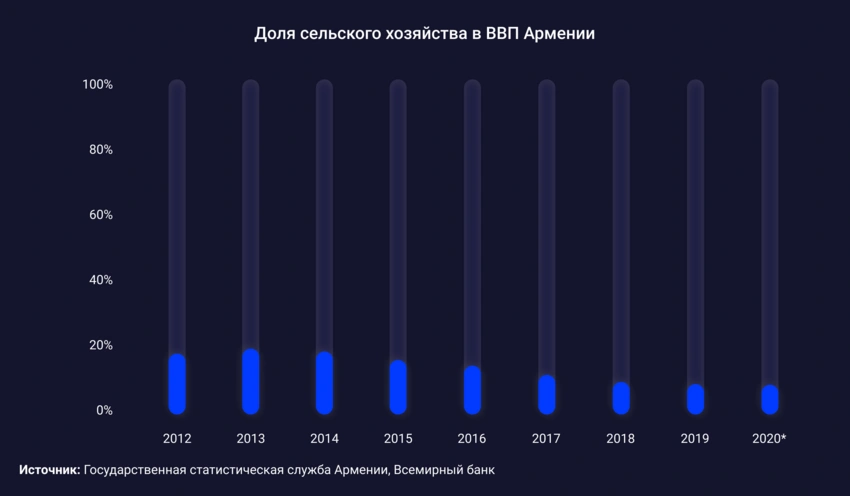 Армения в будущем может столкнуться с очередной серьезной проблемой – нехваткой сельскохозяйственной продукции. Посевная площадь и объемы производства большинства сельскохозяйственных культур в стране сокращаются уже не первый год. Коронавирус, а затем и освобождение Азербайджаном от армянской оккупации Нагорного Карабаха только приблизили кризис.