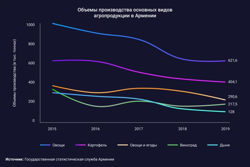 Вот и получается, что копившиеся годами проблемы теперь могут вылиться в настоящую катастрофу. По данным Государственной статистической службы Армении, с 2015 по 2019 годы посевная площадь основных сельскохозяйственных культур сократилась с 337,5 тысяч до 227,9 тысяч гектаров. Посевная площадь картофеля сократилась с 27,8 тысяч до 20,5 тысячи гектаров, овощей – с 28,4 тысяч до 20,6 тысяч гектаров, дыни – с 6,8 тысяч до 4,3 тысяч гектаров, винограда – с 17,3 тысяч до 16,5 тысяч гектаров. Выросла лишь посевная площадь фруктов (40,3 тысяч до 43,4 тысяч гектаров), но как следует ниже, даже это не помогло увеличить производительность.