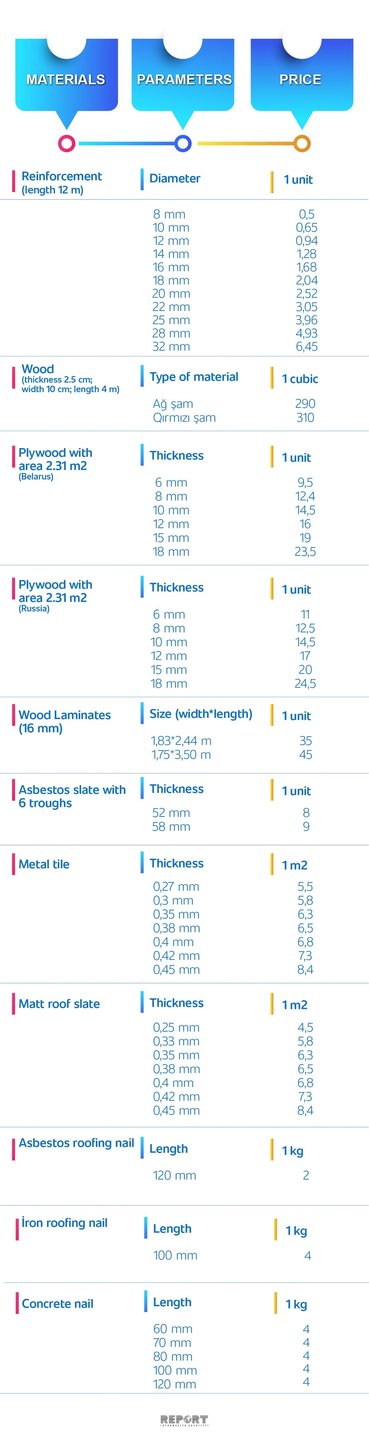 В инфографике ниже представлены цены (в манатах) на различные строительные материалы:
