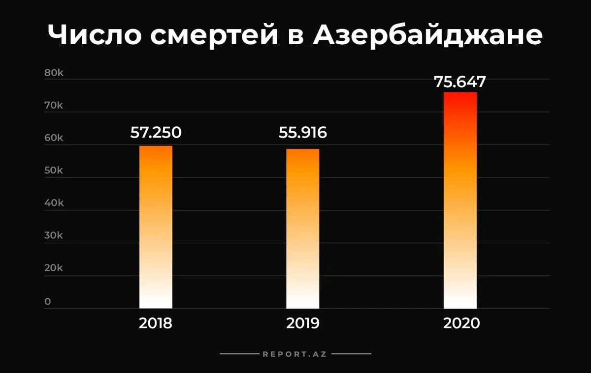 2020 год был достаточно сложным периодом не только для Азербайджана, но и для всего мира. Пандемия коронавируса несла за собой такие неприятности, как рост числа заразившихся, различные новые мутации COVID-19 и карантин. Но больше всего стоит обратить внимание на летальные случаи, которые серьезно отразились на статистике смертности в 2020 году в Азербайджане. На самом деле, не карабахская война, а именно пандемия коронавируса стала первостепенной причиной увеличения числа смертей в прошедшем году. Так, в 2020 году в Азербайджане скончались 75 647 человек, причем в 2019 году это цифра равнялась 55 916 человек, а в 2018 году - 57 250. Таким образом, число смертей в стране в 2020 году возросло на 35%.