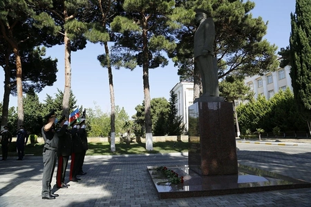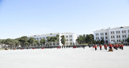 В сопровождении военного оркестра личный состав исполнил Государственный гимн Азербайджана, знамя училища торжественно было вынесено на плац.