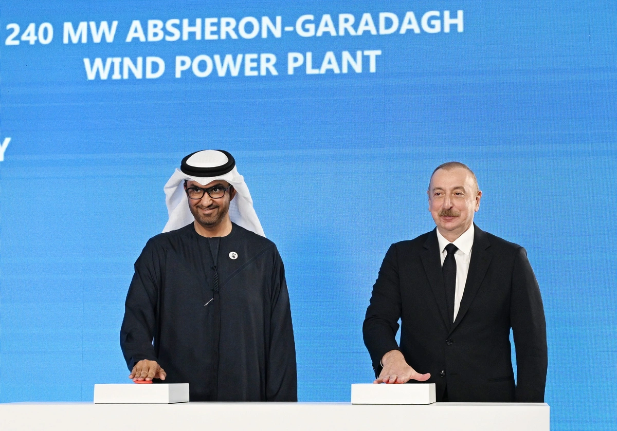 Президент Азербайджанской Республики Ильхам Алиев и министр промышленности и передовых технологий Объединенных Арабских Эмиратов Султан бен Ахмед аль-Джабер в рамках мероприятия заложили фундамент Нефтчалинской, Билясуварской солнечных электростанций и Абшерон-Гарадагской ветряной электростанции.