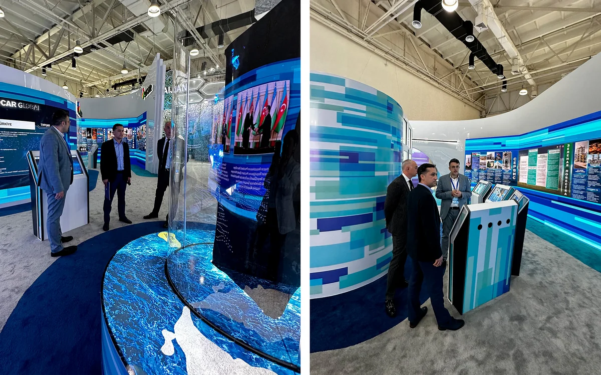 На стенде представлена информация о деятельности SOCAR, включая достижения в различных сферах, представительствах компании в различных странах, и продукции, производимой на НПЗ имени Гейдара Алиева.