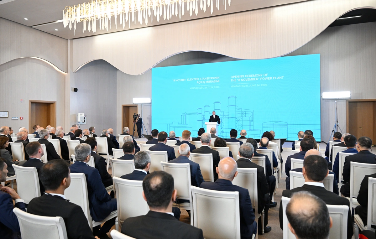 Сегодня знаменательный день в энергетической отрасли нашей страны. Открытие электростанции "8 Ноября" - прекрасное событие. В целом создание этой станции, которая значительно усилит энергетический потенциал Азербайджана, и завершение всех работ в короткие сроки демонстрируют мощь, потенциал нашей страны, опыт и профессионализм наших энергетиков. Сегодня электростанция "8 Ноября" является крупнейшей электростанцией нашей страны. Эта электростанция мощностью 1880 мегаватт, конечно, усилит наш энергетический потенциал, повысит эффективность энергосистемы и, таким образом, еще больше укрепит статус Мингячевира как энергетического центра не только Азербайджана, но и всего Южного Кавказа. В настоящее время более 40 процентов электроэнергии страны вырабатывается в Мингячевире. Вся проделанная работа еще раз показывает, что Азербайджан находится на правильном пути.