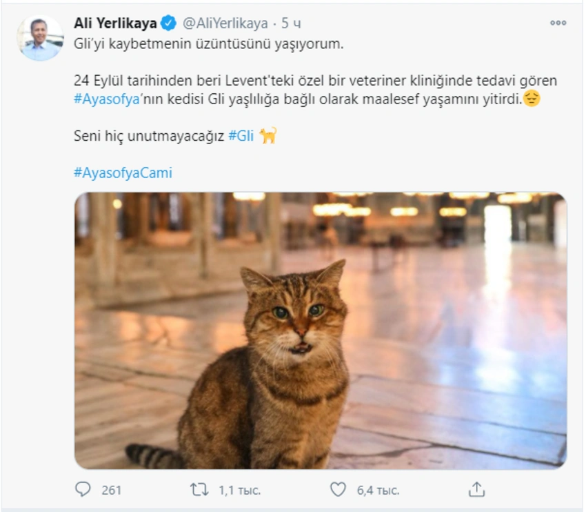 "Я родилась в Айя-Софии, в самом сердце мира. Я просто попрощался с этой жизнью, где я встретила миллионы людей, которые пришли в Сердце Мира с любовью и стали зеркалом света любви. Спасибо всем, у кого в сердце есть отпечатки моих лап", - говорится в сообщении.