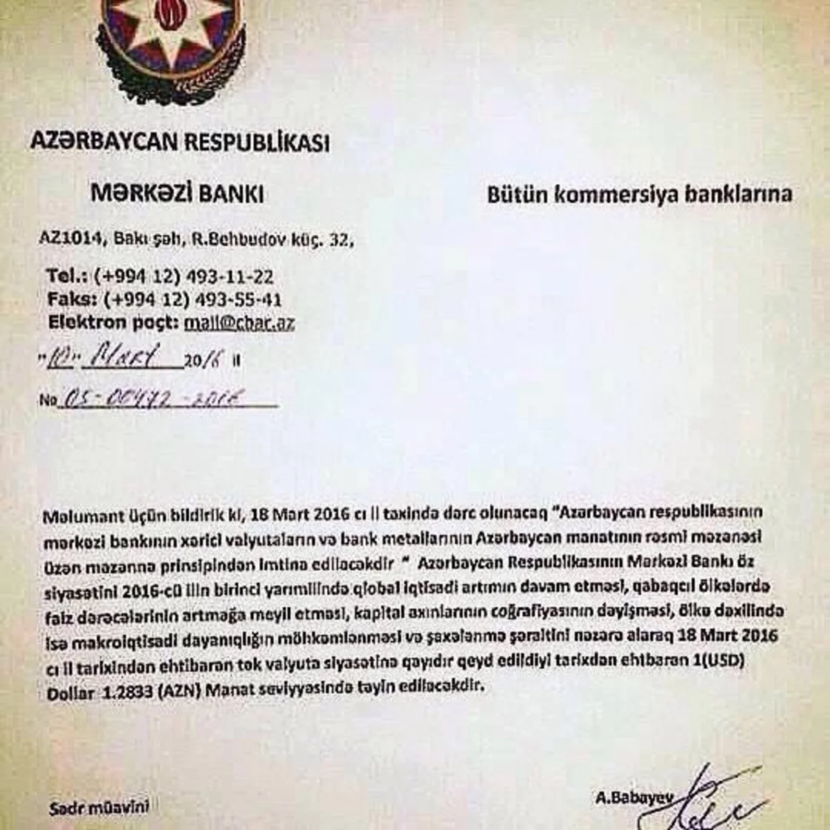 Отметим, что в социальных сетях распространилось якобы адресованное Центробанком коммерческим банкам письмо, в котором ЦБА с 18 марта 2016 года отказывается от политики плавающего курса.