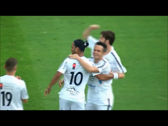 Как сообщает Report, в матче между друзьями Роналдиньо и звездами чемпионата Бразилии 37-летний игрок решился на удар с центра поля и забил гол.