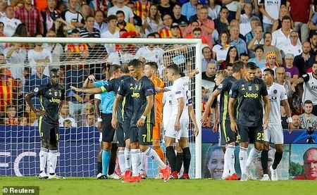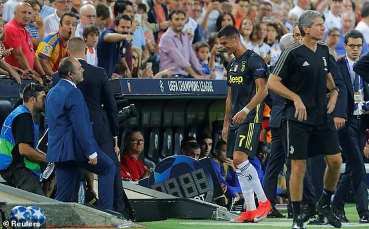 Баку. 19 сентября. REPORT.AZ/ Нападающий «Ювентуса» Криштиану Роналду был удалён с поля в первом тайме матча группового этапа Лиги чемпионов с «Валенсией».