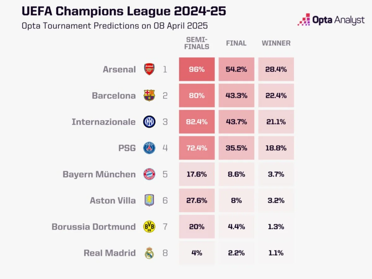 "Команда Микеля Артеты теперь выходит в финал в более чем половине симуляций (54,2%)", – прокомментировала компания свои обновленные прогнозы.