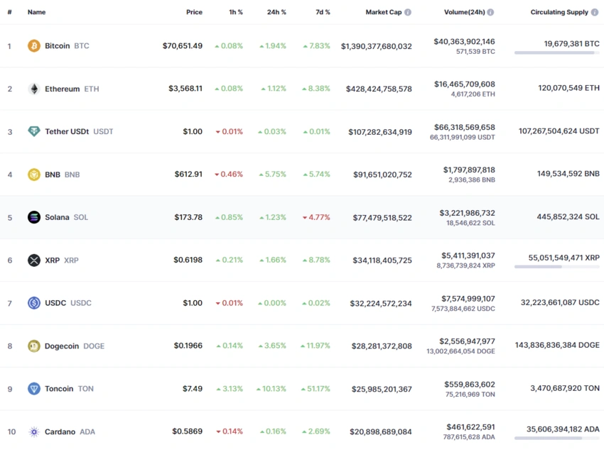 Как сообщает Report, криптовалюта за последние 24 часа подорожала на 1,94% и торговалась по 70,65 тыс. долларов.