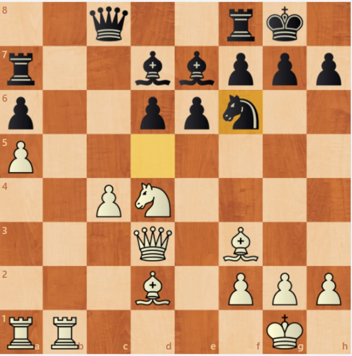 6...Abd7 [6...e6 13 минут. 7.a4 Ac6 6 минут. 8.Axc6 bxc6 9.Vg3! Эта позиция возникала всего в двух играх, и ни в одной из них черным не удалось сровнять счет. Здесь намного проще играть Белыми. (9.Fe2 Этот ход позволяет черным строить укрепления. 9...Fe7 10.Vg3 0–0 11.0–0 d5 (11...a5!?N не позволяет 12.a5!?N) 12.Fh6 (12.a5!?N Лучше было бы зафиксировать пешку a6.) 12...Ae8 13.Ff4 1–0 (51) Гадимбейли A (2404)-Соколовский, Е (2278) Скопье 2019 г. 13...a5!= Обоюдоострая позиция.) 9...Fb7?!N 11 минут. Кажется, решение было принято прямо за доской. 10.Fe2 Fe7 11.Ff4 e5 12.Fe3 0–0 13.0–0 Şh8 14.a5 1–0 (65) Карльсен М (2862)- Гранделиус Н. (2663) Вейк-ан-Зе NED 2021 г.; 6...g6 Намеревается играть в духе системы дракона. 7.Fg5 Fg7 8.0–0–0 0–0 9.f4 Abd7 (9...Ac6? 10.e5! (10.Axc6? bxc6 11.e5 Ad5 12.Axd5 cxd5 13.Va3 (13.Vxd5 Fe6 14.Vf3 Vc7–+ Черные получают отличную компенсацию за пожертвованную пешку. У белых нет возможности сохранить пешку и защитить короля.) 13...Vc7 14.Fd3 Tb8–+ 0–1 (22) Ван Форест Дж. (2461)-Фон Мейенфелд, Б (2331) Дирен 2014) 10...Ag4 11.Axc6 bxc6 1–0 (34) Сунилдут Лайна Н. (2618)-Кеймер В (2568) chess24.com INT 2020 12.exd6! Af2 13.Ve2 Axd1 14.dxe7 Axc3 15.exd8V Axe2+ 16.Fxe2 Txd8 17.Fxd8 Fh3! 18.gxh3 Txd8 19.Fxa6 Ta8 20.Fc4 Ta4 21.Fb3 Txf4 Черные могут свести игру к ничьей.) 10.Fe2 h6! (10...e5? 11.fxe5 Axe5 12.Vd2 Te8 13.Thf1+– От связки невозможно избавиться.) 11.Fh4 (11.Fxf6!? N Axf6 12.f5 Идея состоит в том, чтобы остановить ход черных ... e5. 12 ... e5 13.fxe6 fxe6 14.Vg3 У черных есть пара слабостей в пешечной структуре.) 11 ... e5! 12.Ab3 (12.fxe5 теперь неэффективен из-за: 12 ... Axe5 13.Vd2 Te8 14.Thf1 Axe4! Это ход 10 ... h6! Слон на h4 находится в висячем положении.) 12 ... exf4 13.Vxd6 Ve8 14.The1 Ve5 Неясная позиция 1 / 2–1 / 2 (48) Витюгов, Н (2740) -Камский, G (2670) Сочи 2018]