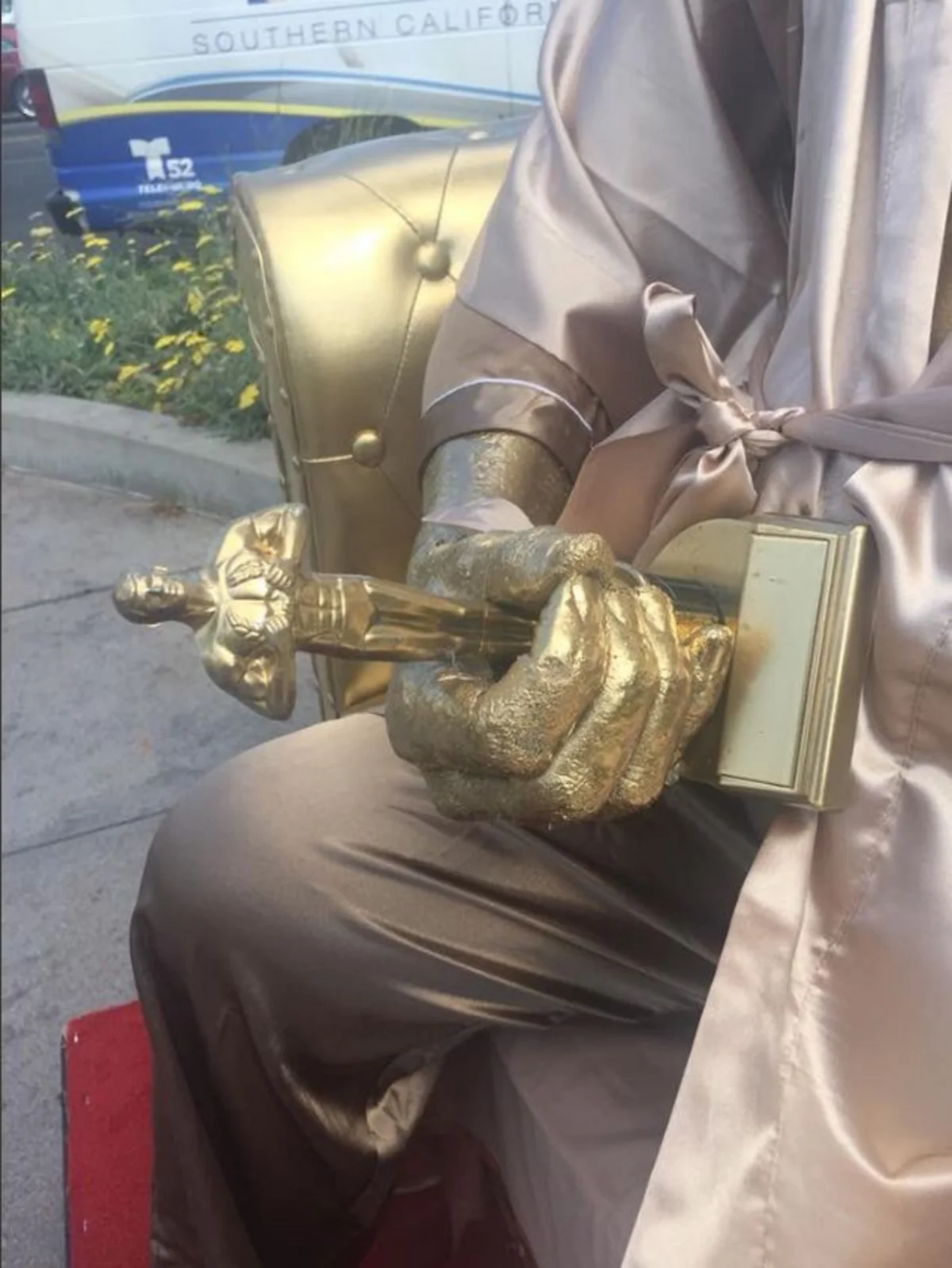 Отмечается, что окрашенная в золотой цвет скульптура установлена на Ла Бреа-авеню. На ней Вайнштейн представлен сидящем в халате на софе со статуэткой «Оскара» в руках.