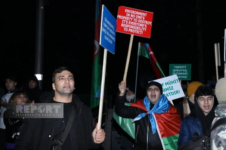 Участники мирной акции протеста поют Государственный гимн Азербайджана, а также скандируют лозунги "Азербайджан - хозяин своих недр!", "Конец экологическим преступлениям!", "Стоп экотеррору!", "Нет экологическому террору!" и т.д.