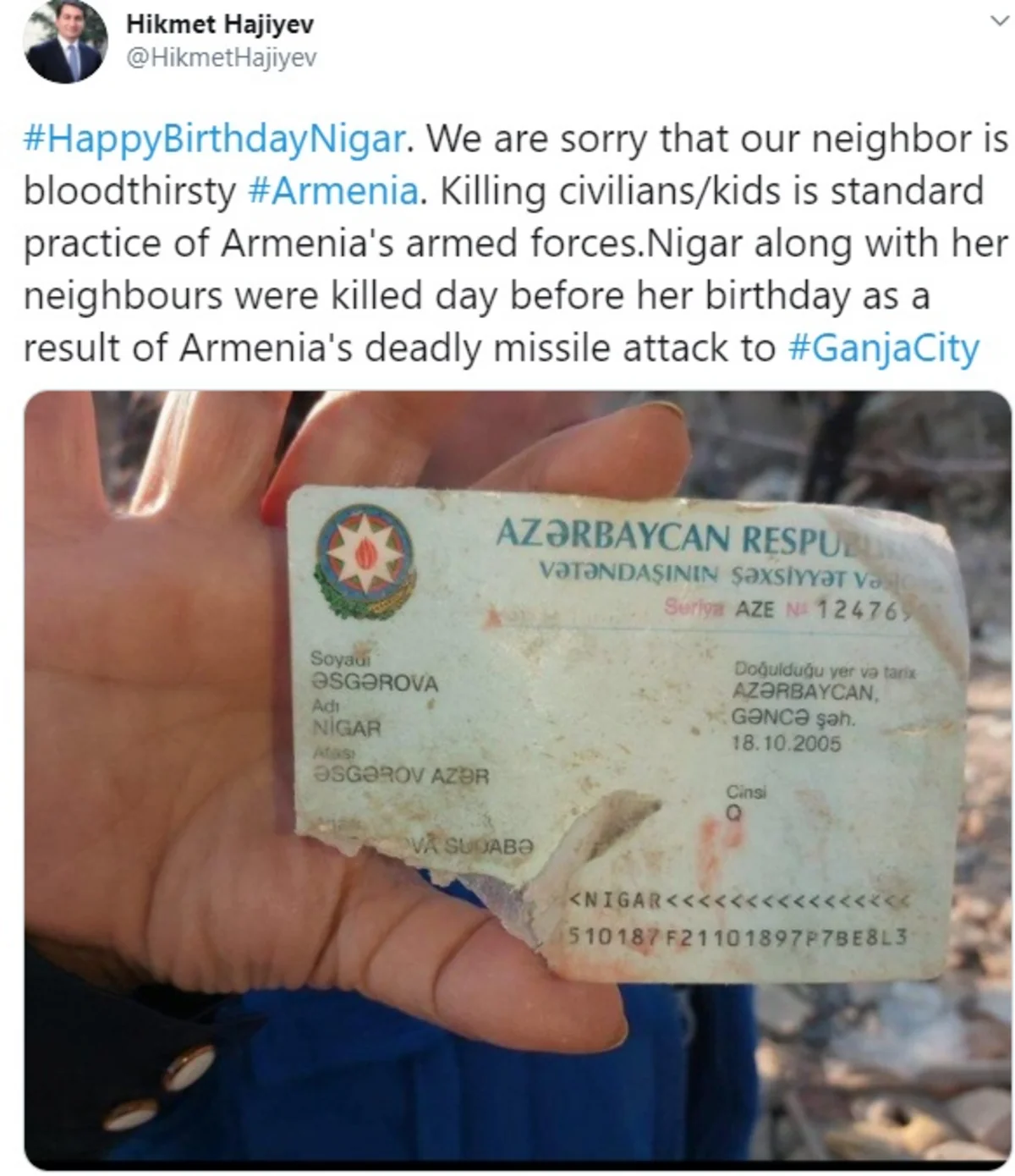 "Убийство мирных жителей, детей – стандартный опыт вооруженных сил Армении. Нигяр убита за день до своего дня рождения в результате ракетной атаки на Гянджу", - отметил он.