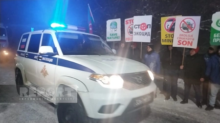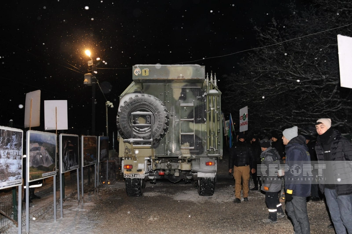 Экоактивисты, представители НПО, не создавая помех движению в обоих направлениях, демонстрируют плакаты и скандируют лозунги на азербайджанском, русском и английском языках. Они требуют положить конец экологическому террору в Карабахском экономическом районе Азербайджана.