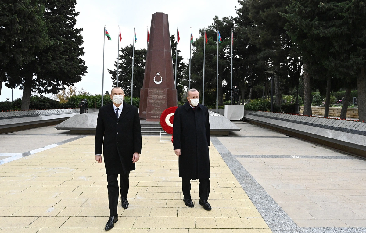 Затем президенты Азербайджана и Турции, посетив на Шехидляр хиябаны памятник, возведенный в честь ставших шехидами турецких солдат, возложили к нему венки.
