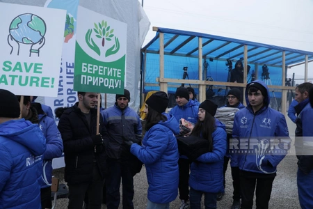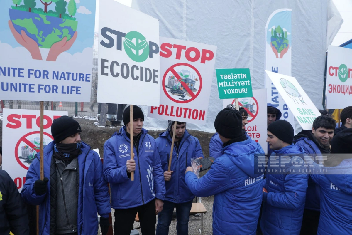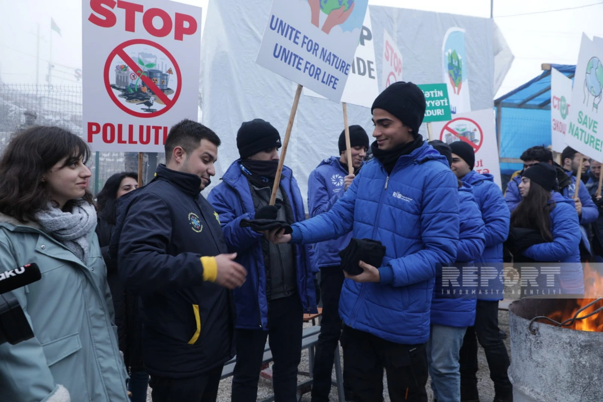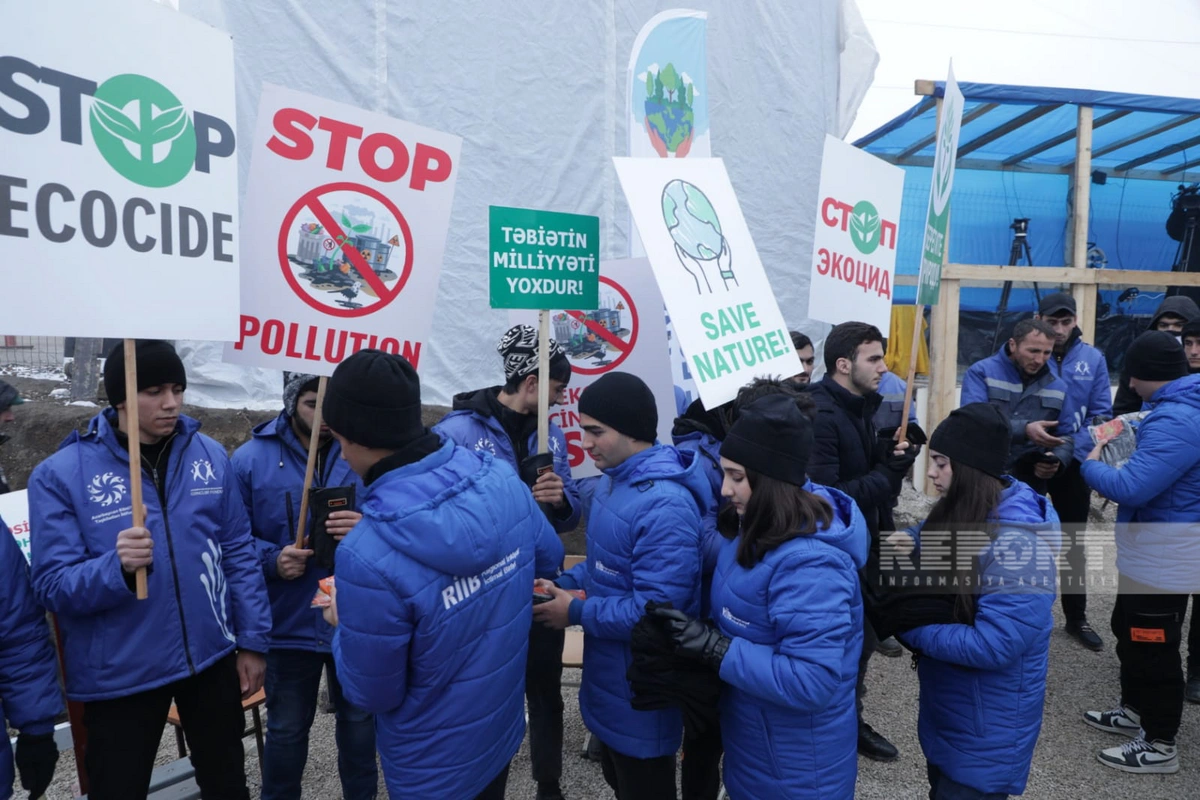 Несмотря на холод и продолжающийся снег собравшиеся не расходятся, они исполняют Государственный гимн Азербайджана, скандируют патриотические лозунги и требуют остановить экологический террор.