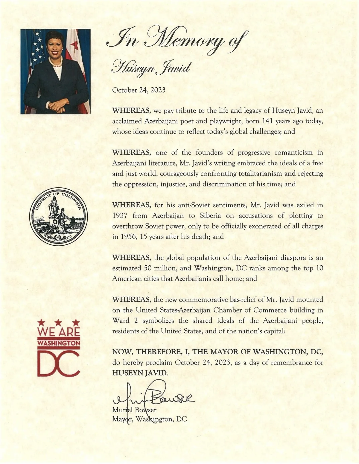 Отметим, что в прошлом году в день 140-летнего юбилея Гусейна Джавида, который также был объявлен днем памяти Гусейна Джавида в Вашингтоне, состоялось открытие барельефа драматурга. Монумент установлен на административном здании Торгово-промышленной палаты США, расположенном в историческом районе Джорджтаун.