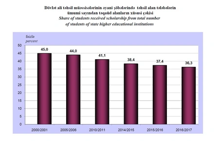 Баку. 20 октября. REPORT.AZ/ В общем числе студентов, получающих образование на очном отделении государственных высших учебных заведений Азербайджана есть рост, однако удельный вес получающих стипендию по сравнению с 2000 годом значительно сократился и продолжает сокращаться.
