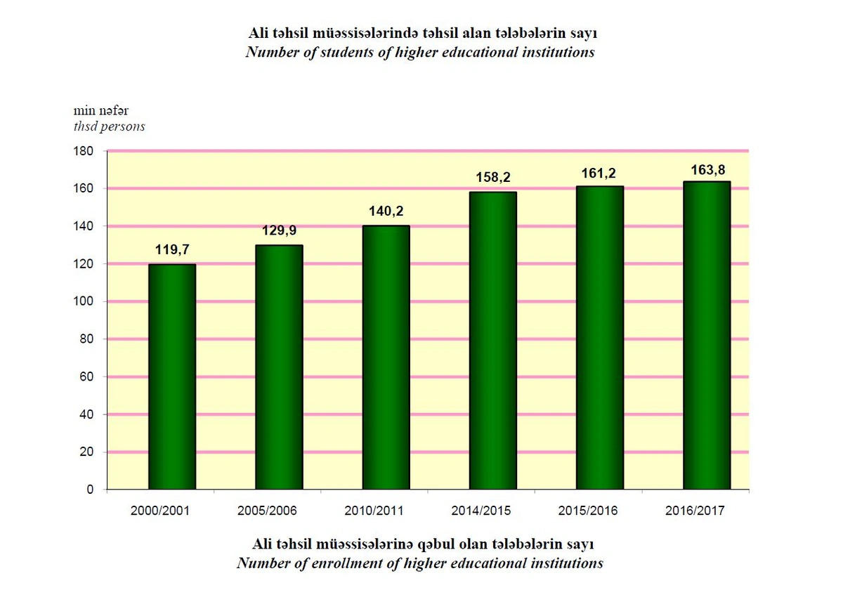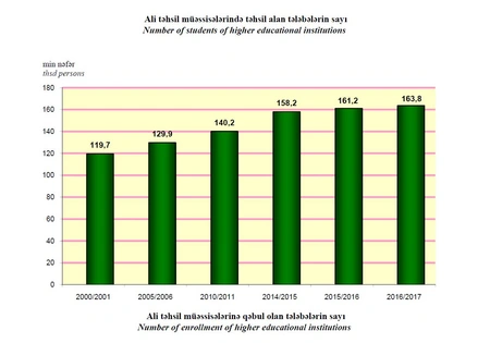 Отметим, что в 2000/2001 учебном году число студентов, обучающихся в высших учебных заведениях, составило 119,7 тыс. человек, в 2015/2016 учебном году - 161,2 тыс., в 2016/2017 учебном году - 163,8 тыс. человек.