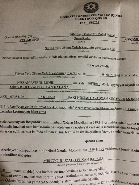 Как сообщает Report, в протоколе указано имя Мирзагулузаде Эльхана Балага оглу, который, якобы, 4 января этого года, проезжая на автомобиле Nissan Patrol по территории села Хыдырлы, попал на радар на 29-м километре Сальянского шоссе. Был выписан штраф на сумму 50 манатов. В протоколе утверждается, что автомобиль Э.Мирзагулузаде не прошел техосмотр, что является нарушением статьи 339.1-1 Кодекса административных проступков.