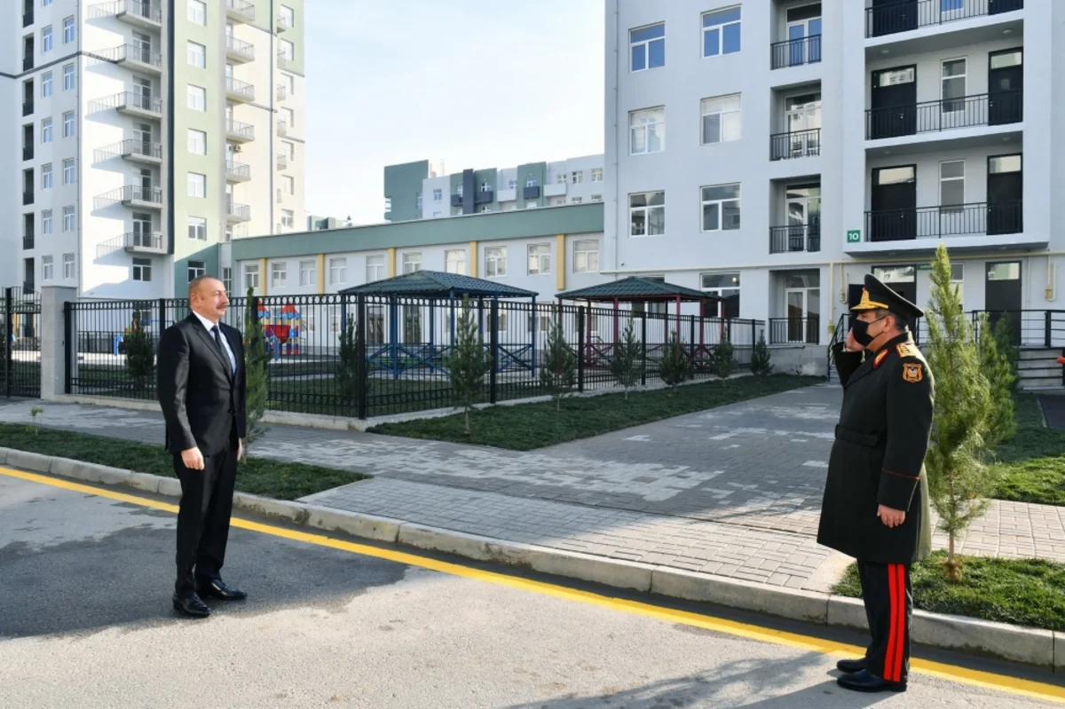 Затем президент Ильхам Алиев прибыл в Ясамальский жилой комплекс ГАЖС. В этом комплексе квартиры предоставлены 82 семьям военнослужащих. Глава государства посмотрел квартиры.