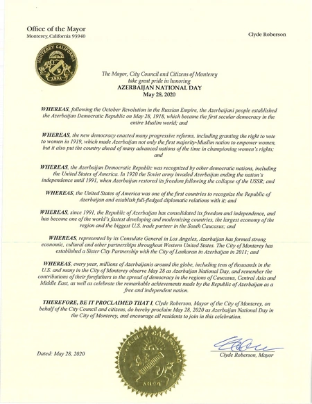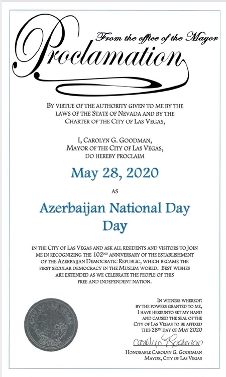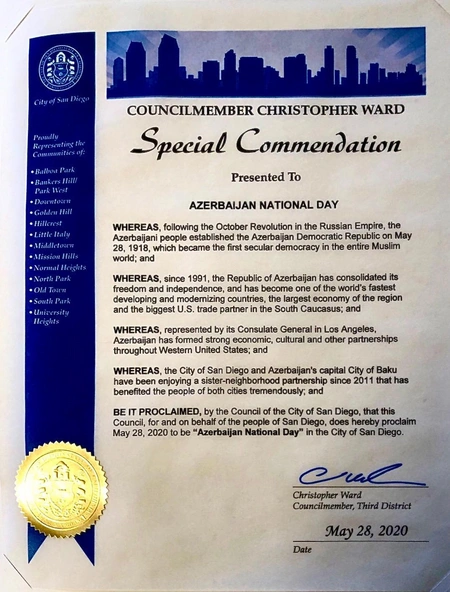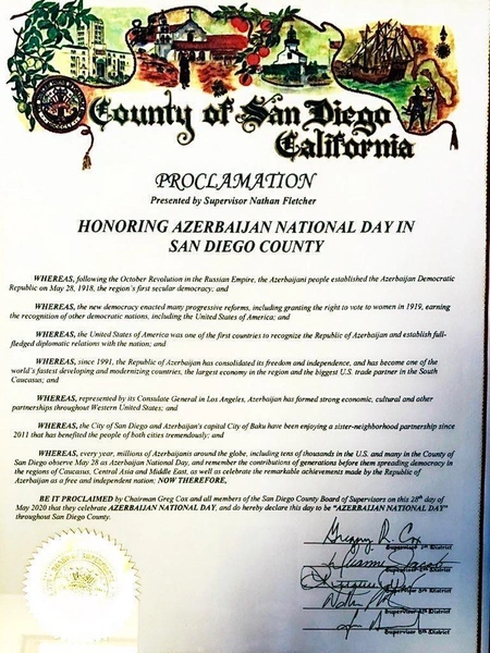 В конце деклараций отмечается, что 28 мая в Лас-Вегасе (самый крупный город штата Невада), Гонолулу (столица штата Гавайи), Сан-Диего (второй по величине город штата Калифорния) и Монтерее (штат Калифорния) объявлен "Национальным днем Азербайджана", всех городских жителей пригласили отметить этот праздник.
