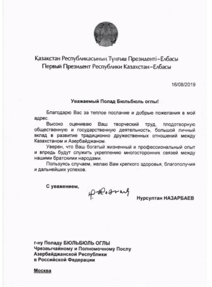 Первый президент Казахстана Нурсултан Назарбаев написал письмо Чрезвычайному и полномоченому посолу Азербайджана в России Поладу Бюльбюльоглу.