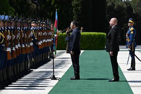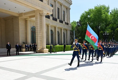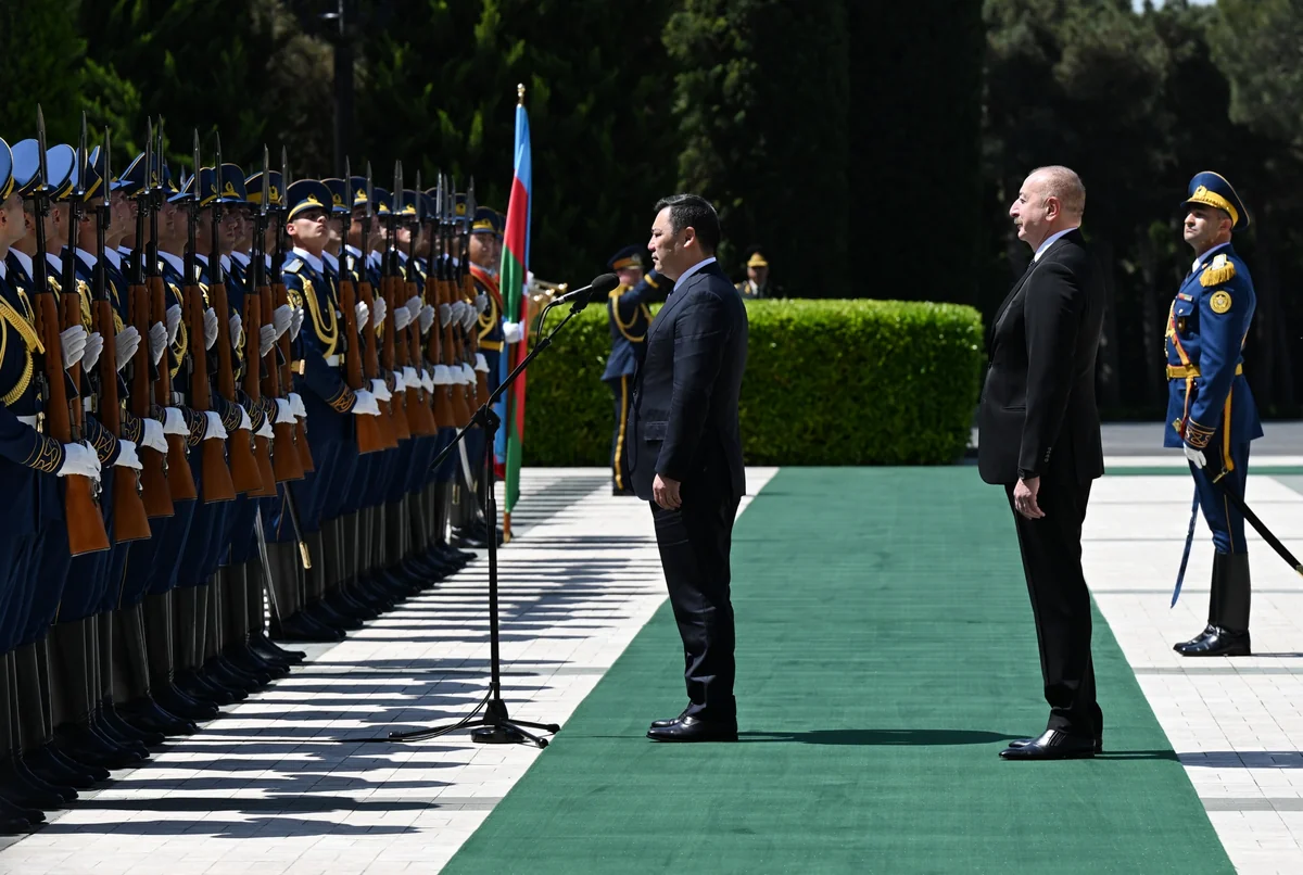 Под звуки военного марша почетный караул прошел перед президентом Азербайджана Ильхамом Алиевым и президентом Кыргызстана Садыром Жапаровым.