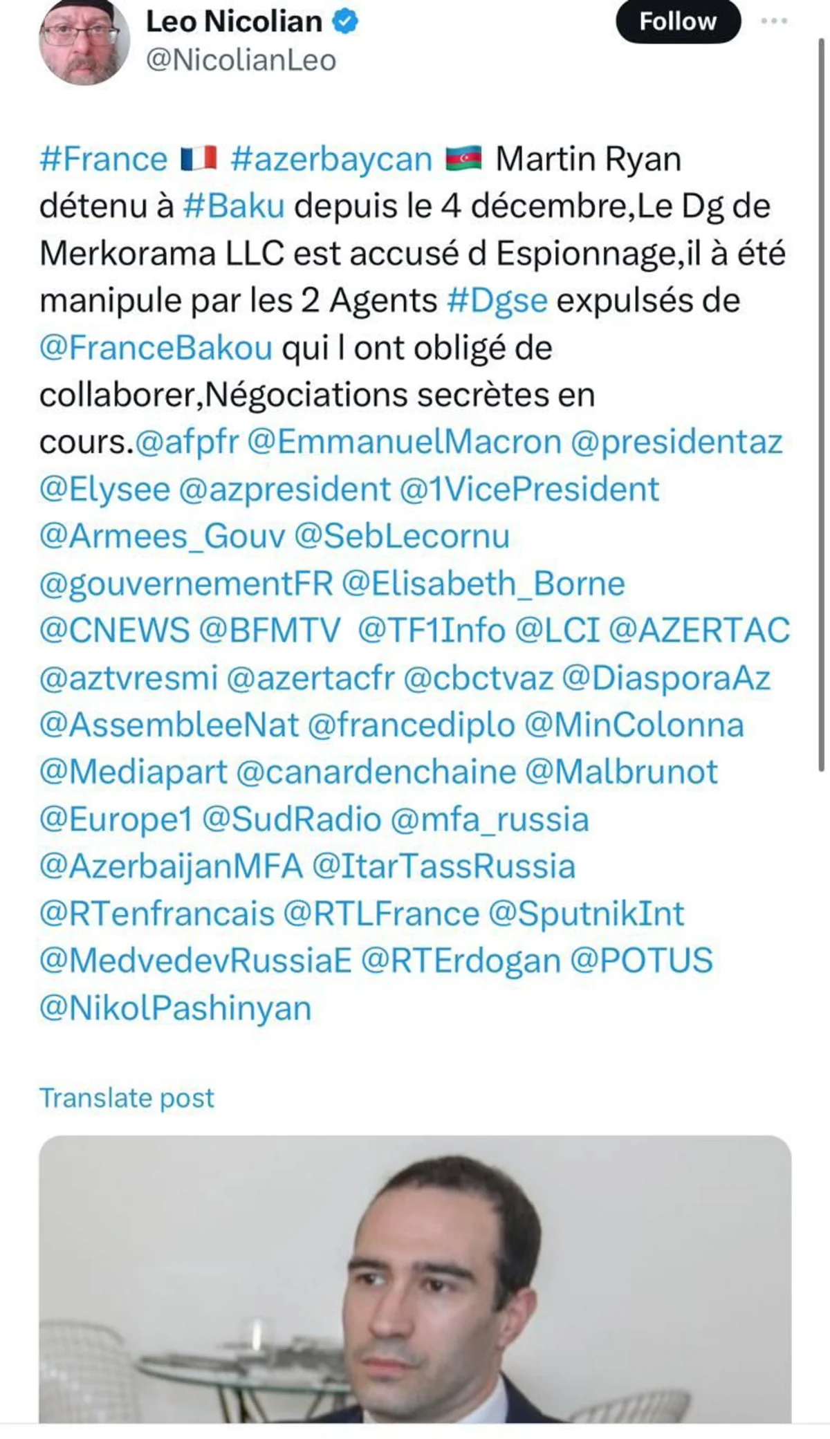 Одним из арестованных в Азербайджане членов шпионской сети Франции является гражданин этой страны Мартин Райан.