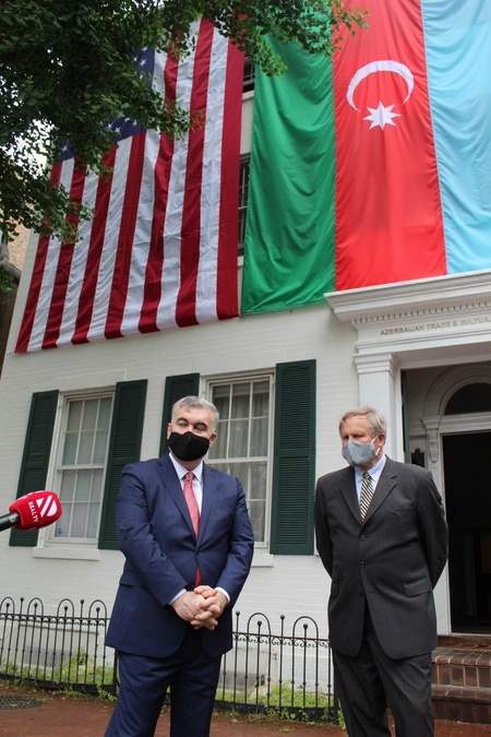 В связи с памятной датой перед зданием Палаты состоялось мероприятие с участием посла Азербайджана в США Элина Сулейманова, экс-посла США в Азербайджане Роберта Секуты, сотрудников посольства и журналистов.