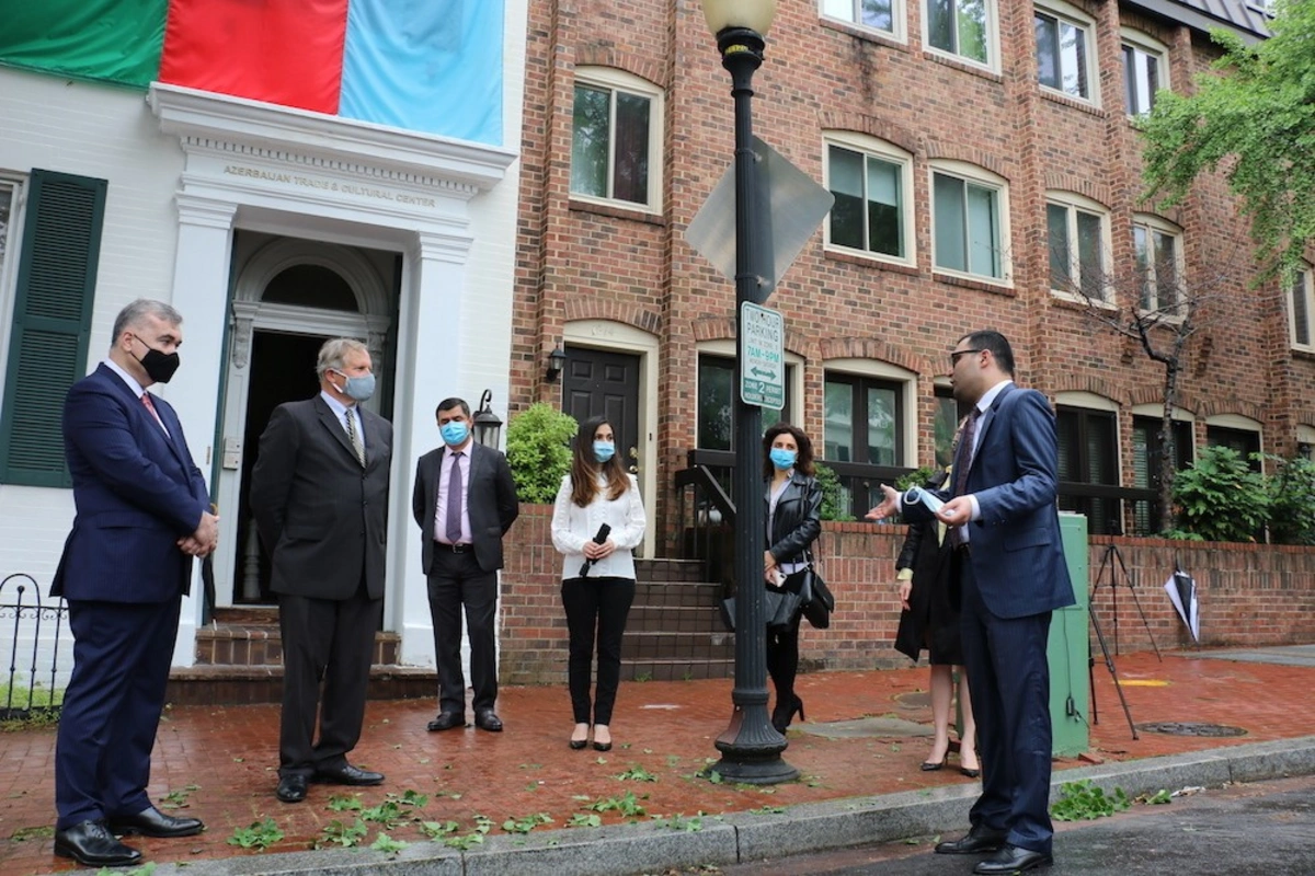 По случаю 102-й годовщины провозглашения Азербайджанской Демократической Республики на административном здании Американо-Азербайджанской торговой палаты (USACC) были вывешены флаги Азербайджана и США.